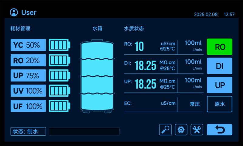 ★全自動(dòng)微電腦控制,7寸彩色觸摸屏人機(jī)操作界面(尺寸1540*85mm),動(dòng)畫(huà)顯示工作模式,中英文雙語(yǔ)言自由切換,圖示化顯示耗材壽命、儲(chǔ)水狀態(tài)、水質(zhì)狀態(tài)等運(yùn)行參數(shù),可選配物聯(lián)網(wǎng)(LOT)和云端遠(yuǎn)程管理平臺(tái),實(shí)現(xiàn)遠(yuǎn)程診斷、監(jiān)控、日常操作及儀器和云端雙備份運(yùn)行數(shù)據(jù)信息。