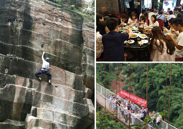 說到金雞谷就不得不提到攀巖、吊橋和漂流了。喜歡冒險,挑戰(zhàn)的同事參加了攀巖這項活動,攀巖項目驚險刺激,它不同于我們常見的人工巖壁,它充滿不確定因素,讓這些想挑戰(zhàn)自己的小伙伴們躍躍欲試,不斷挑戰(zhàn)自己的極限。