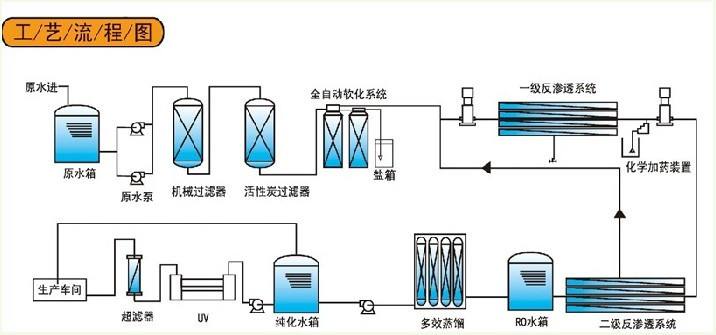 (1)預(yù)處理+ 一級反滲透+二級反滲透+滅菌裝置+循環(huán)系統(tǒng)